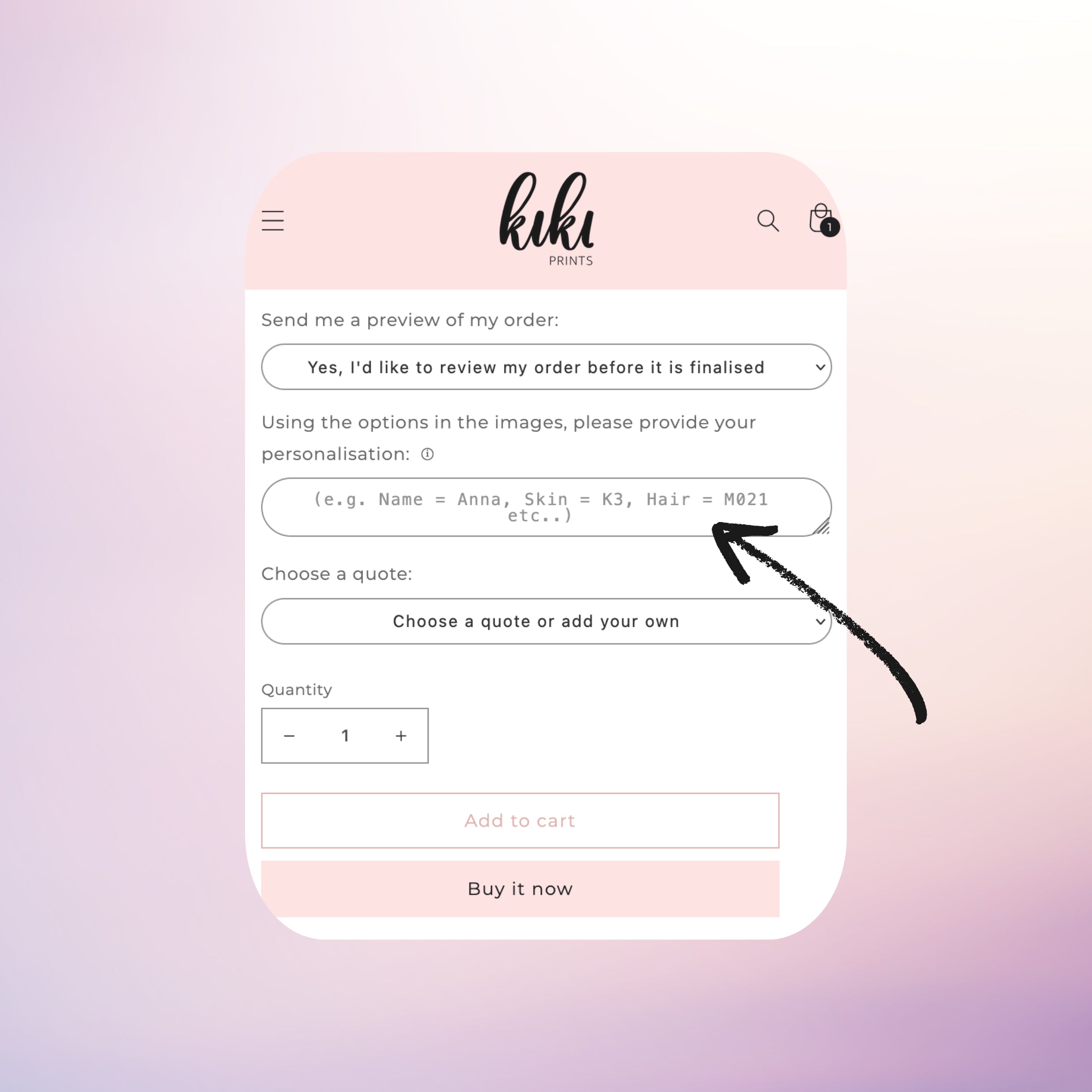 Enter your choices in the personalisation box and place an order or send them to us after you place an order.
