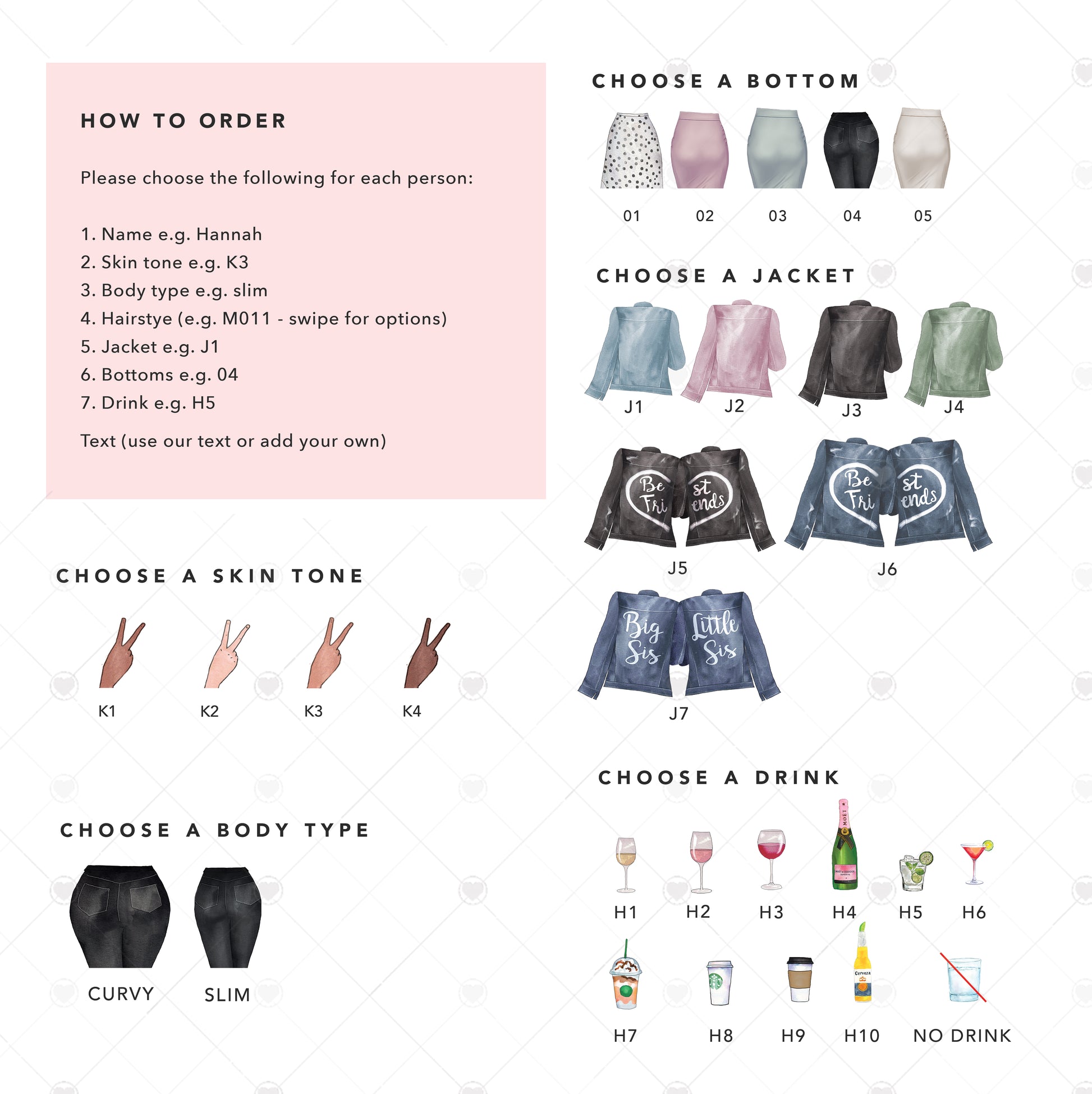 To customise, look at the options in the images and enter your choices in the Personalisation box below e.g - Name = Anna / Skin = K1 / Hair = 2012c / Body = Slim/ Top = J1 / Bottoms = 01 / Drink = H2