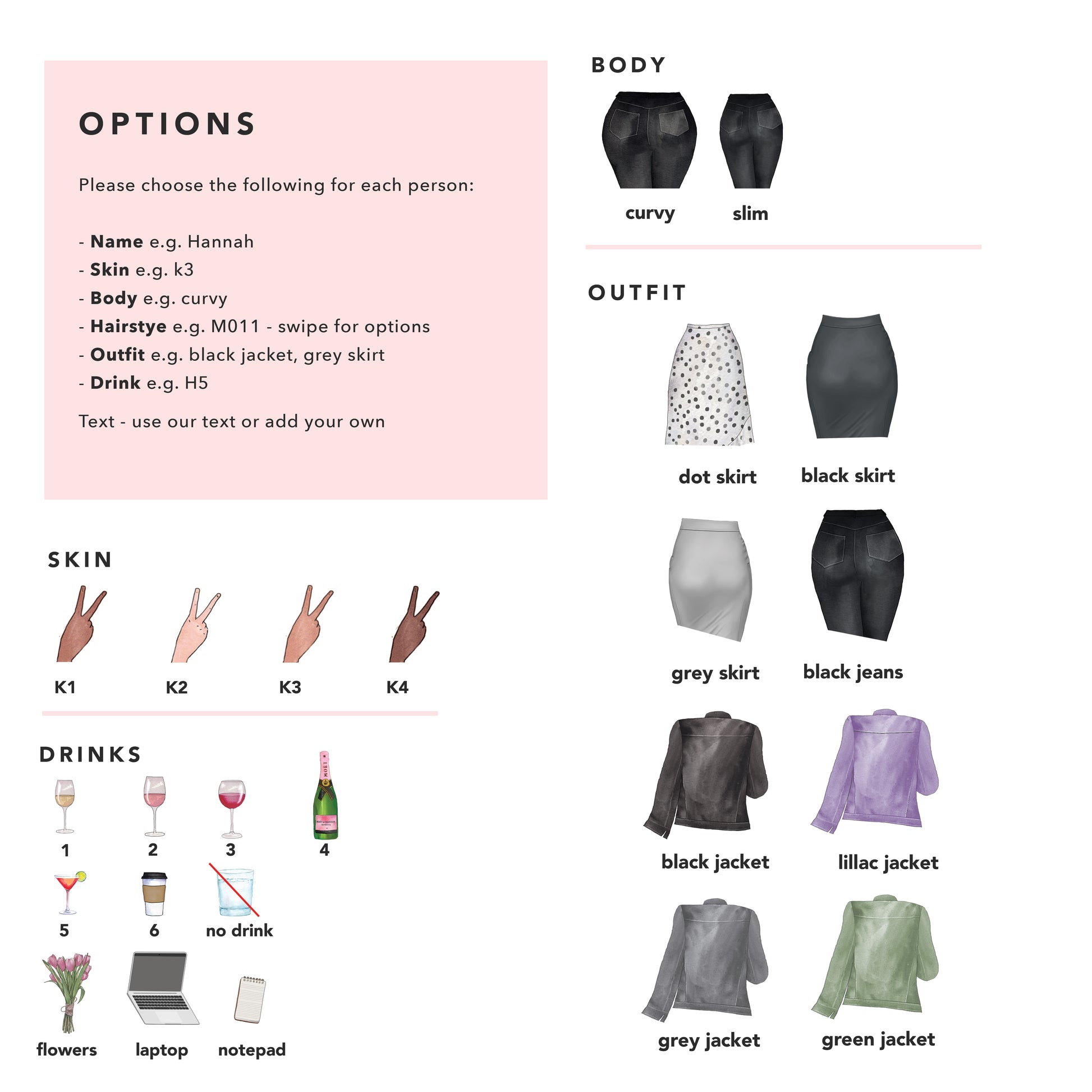 To customise, look at the options in the images and enter your choices in the Personalisation box below e.g - Julie, Skin = K2, Hair = 2012A, Slim, Lillac Jacket + Black Jeans, H4 Drink