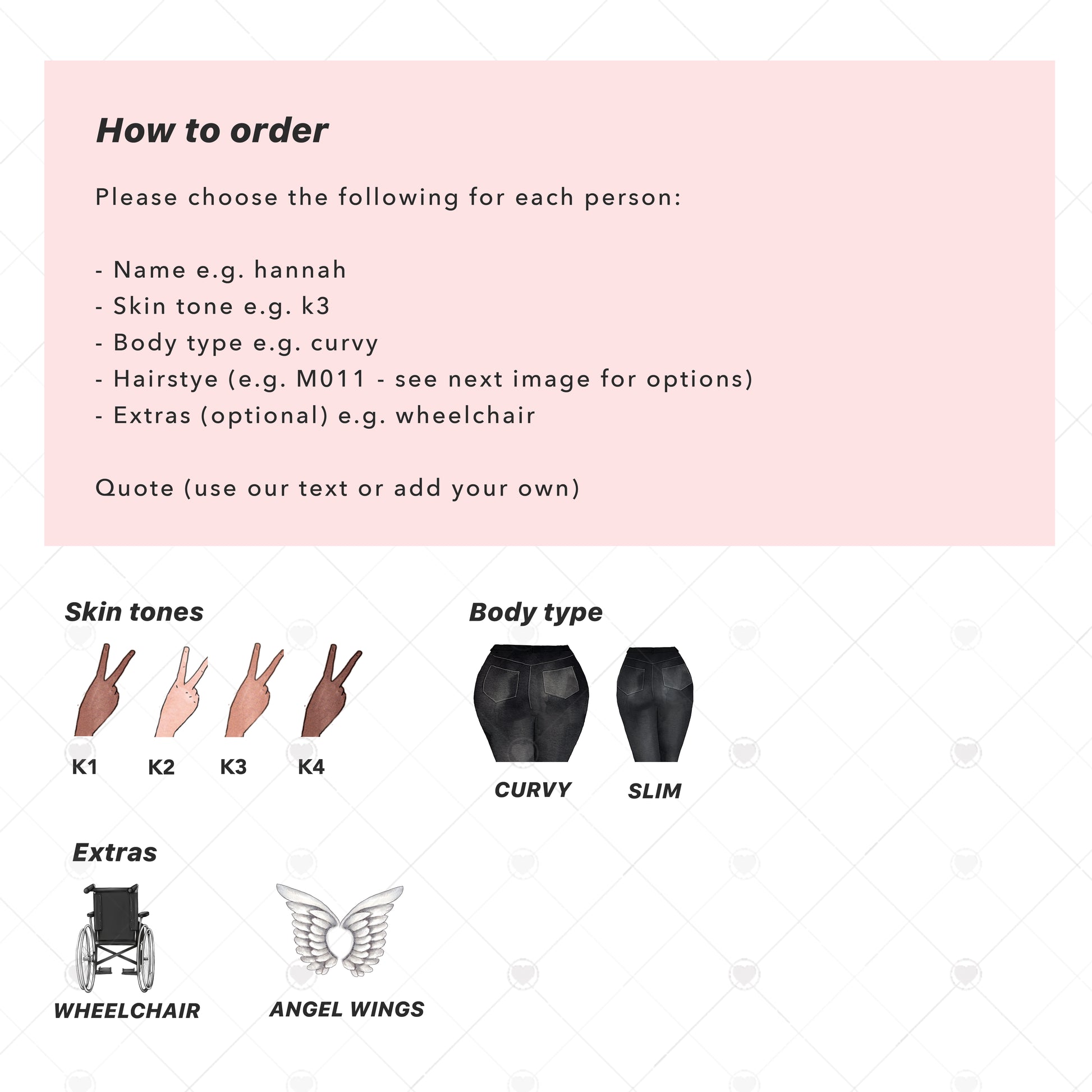 To customise, look at the options in the images and enter your choices in the Personalisation box below e.g - Anna, skin K2
