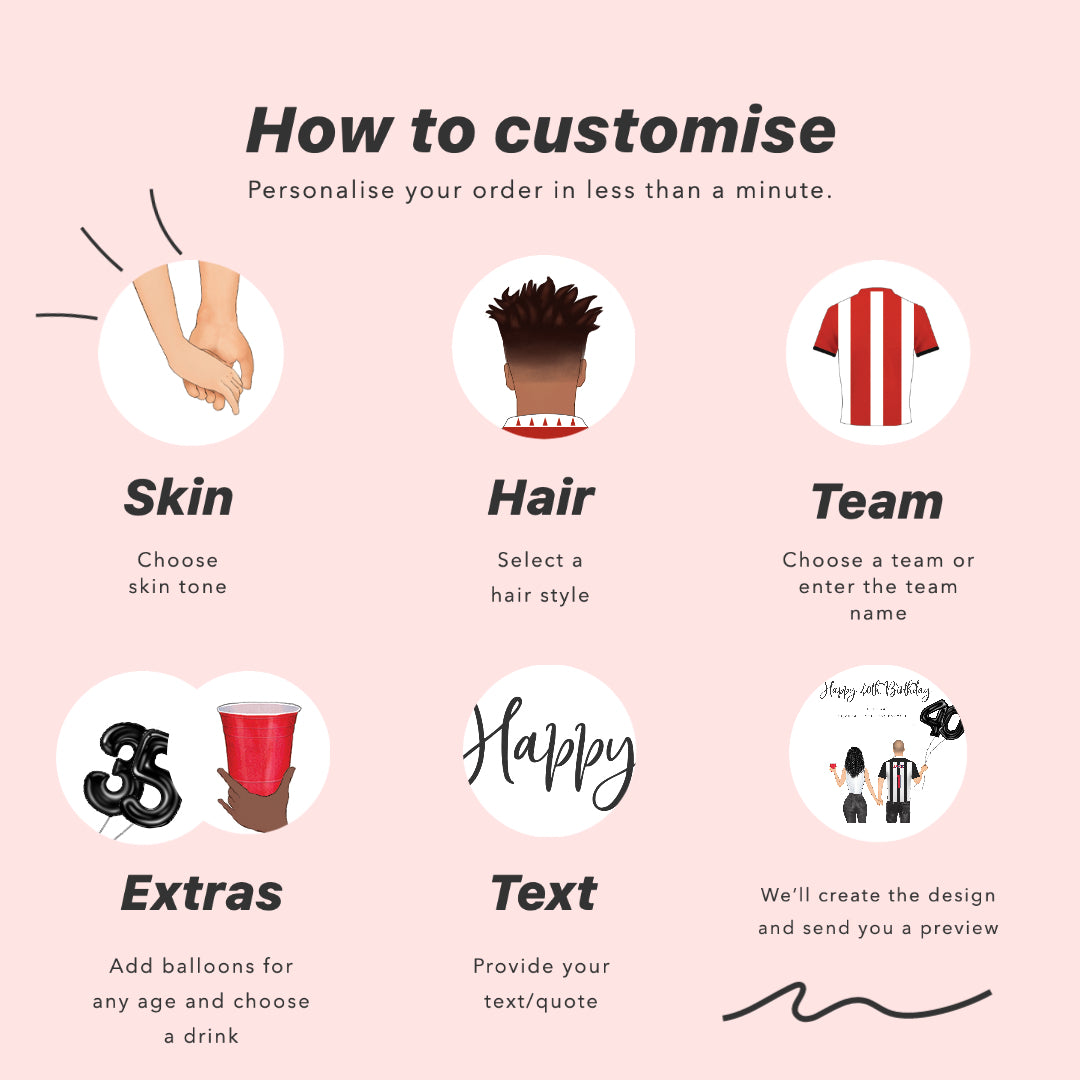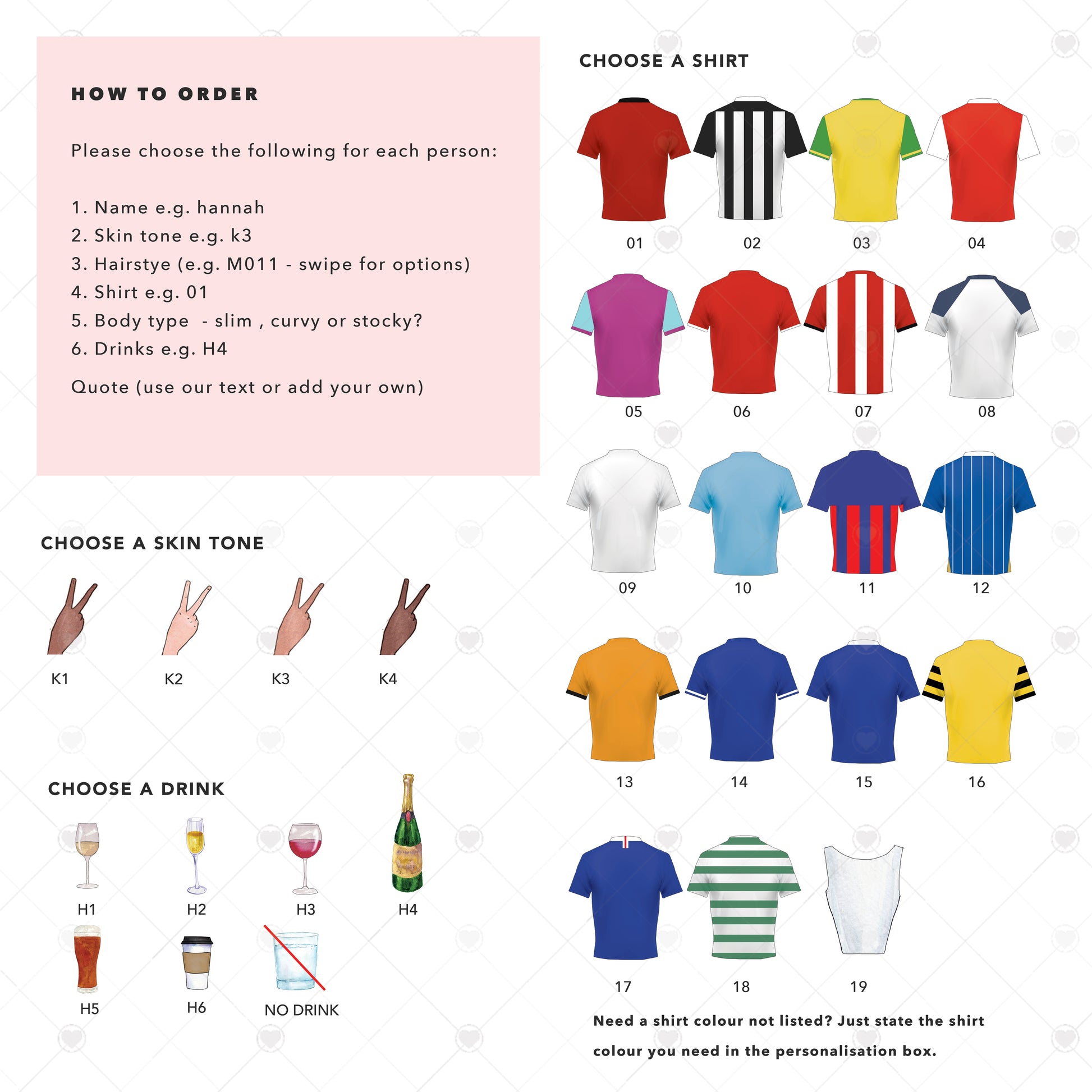 To customise, look at the options in the images and enter your choices in the Personalisation box below e.g - Mike, skin K2, shirt 01, drink h1, name on shirt 'Jones'