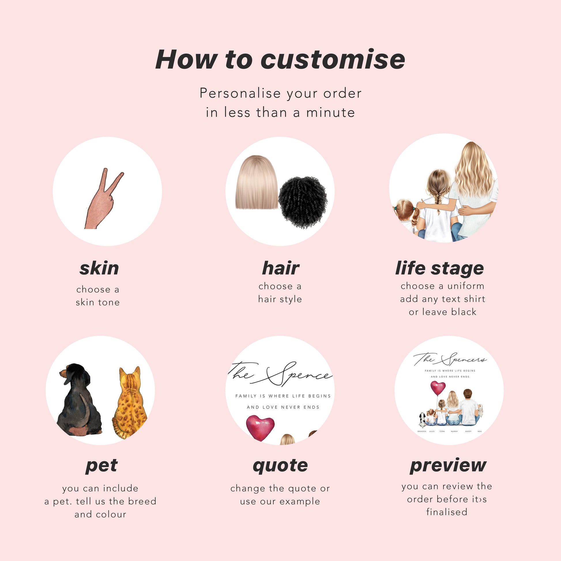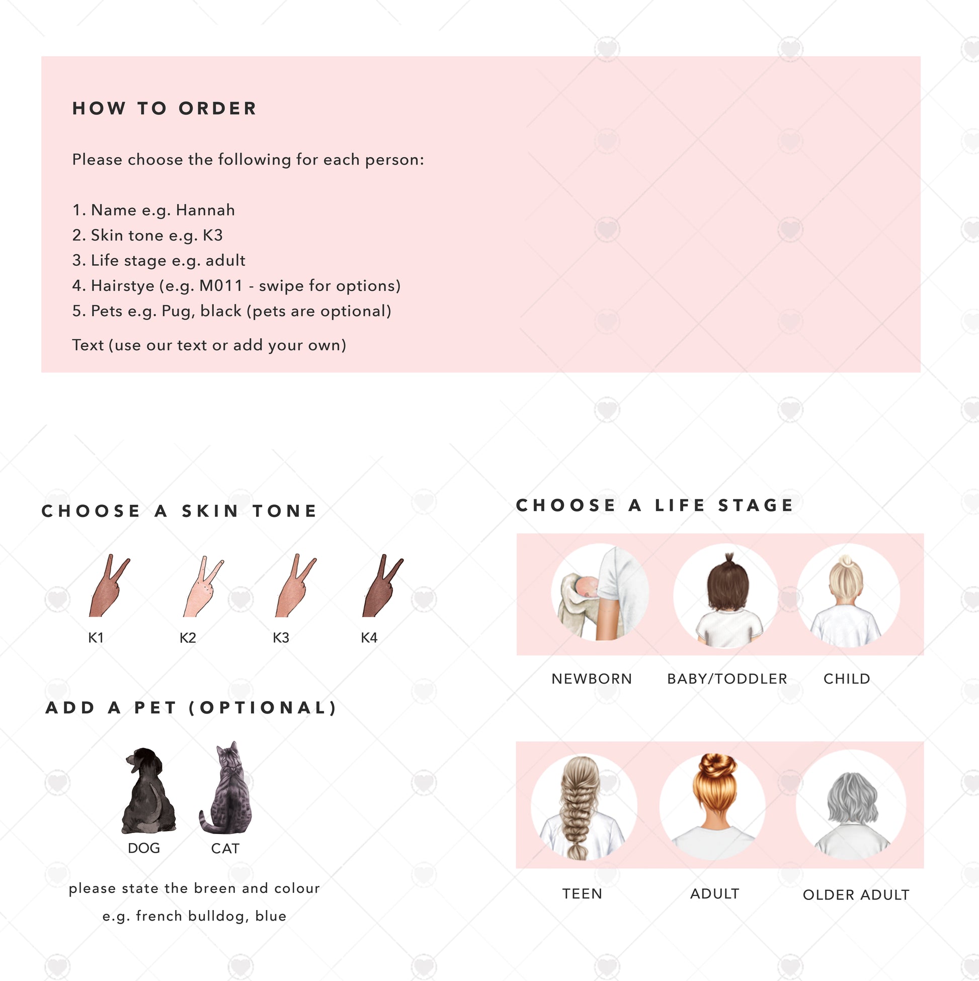 To customise, look at the options in the images and enter your choices in the Personalisation box below e.g - Name = Amelia / Life stage = Adult / Skin = K2 / Hair = 2012c