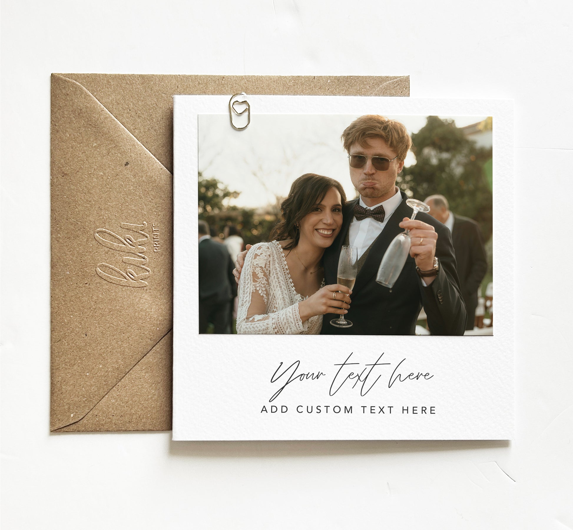 Personalise the card with your own photo and text. The photo is printed on high quality photo paper which is fixed to the card. An elegant heart paper clip is added for a sophisticated decorative finish. This card is ideal for Valentine’s Day as a gift for him or her. A Kraft envelope is included.